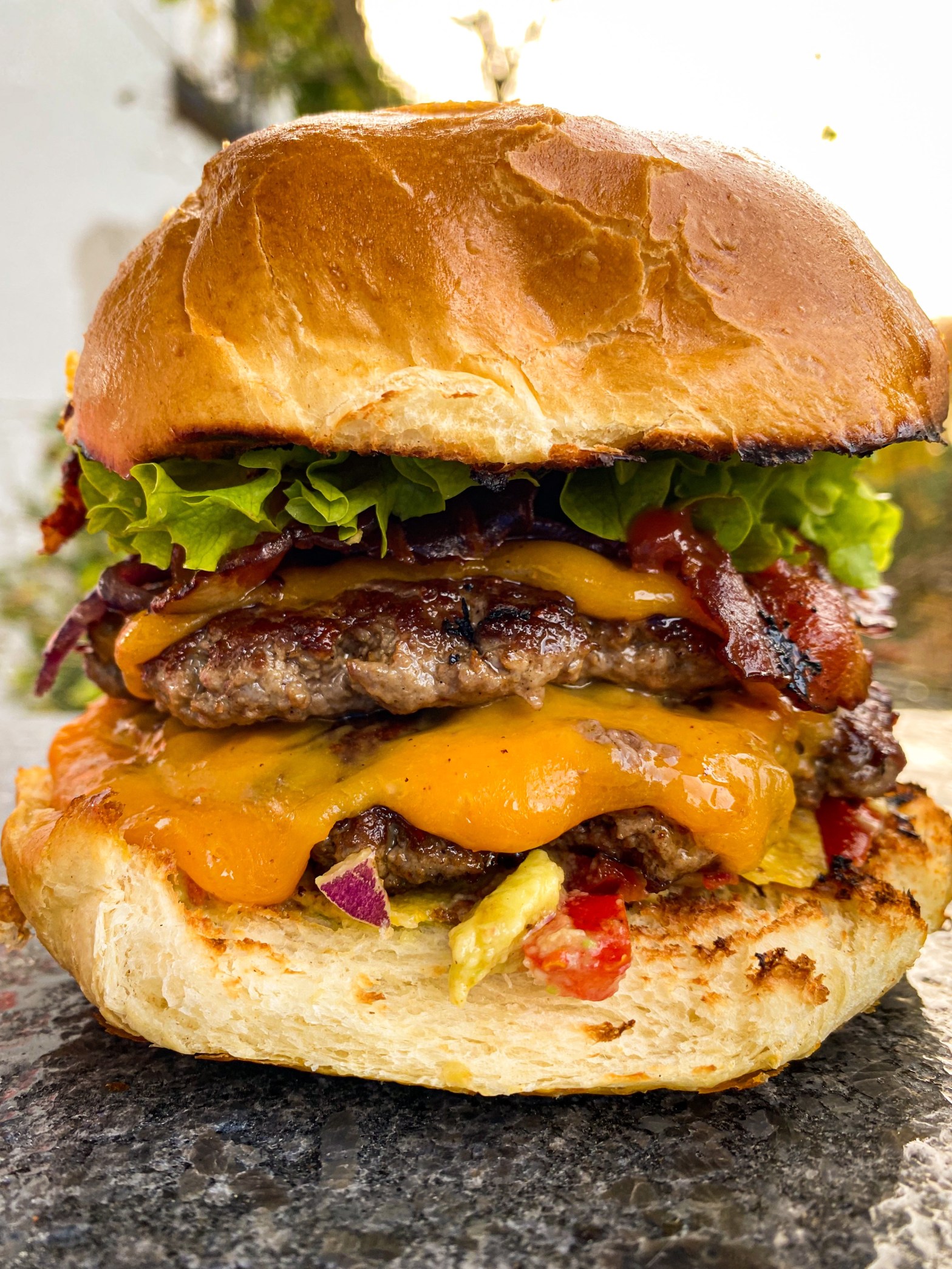 Zuerst besorgt man sich ein vernünftiges Burger Pattyie. Ich wolfe am liebsten ein Rumpsteak und gebe dazu ein bisschen weißen Schweine Speck. The Bacon wird bei 180° in direkt in den Grill oder in den Backofen gelegt. Die Zwiebeln werden in einer Pfanne oder auf einer Plancha angebraten und mit ein bisschen Zucker karamellisiert. Sobald Zwiebeln fertig sind stellt man sie einfach in eine Schale an die Seite. Da meine Bürger genug Fett im Fleisch haben, werden diese direkt in einer Pfanne oder auf einer Plancha angebraten. Sobald auf der Oberseite des Burgers Fleischsaft austritt wird dieser gewendet. Dann legt ihr eine Scheibe Cheddar Chesse auf den Burger und lasst den Käse zerschmelzen. Belegt wird der Burger wie folgt. Auf das untere Brötchen kommt die Guacamole, Nachos, Burgerpattie, karamellisierte Zwiebeln, Bacon, Heinz 57 Ketchup, Peperonis und Salat.